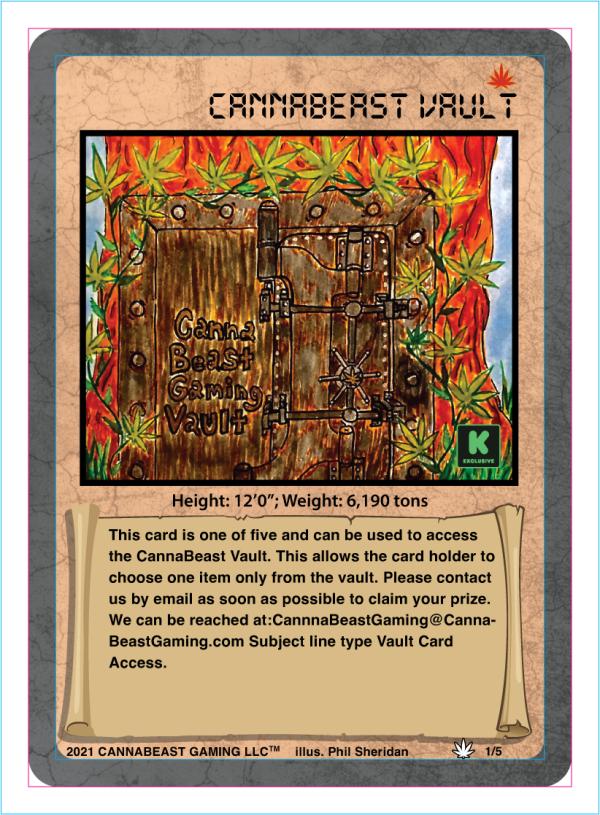 This card is one of five and can be used to access the CannaBeast Vault. This allows the card holder to choose one item only from the vault. Please contact us by email as soon as possible to claim your prize. We can be reached at:CannnaBeastGaming@Canna- BeastGaming.com Subject line type Vault Card Access.