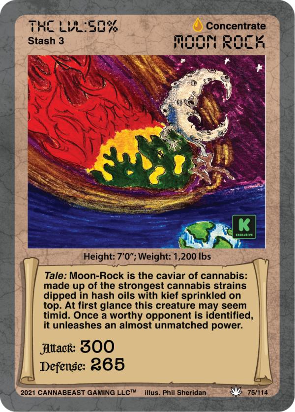 Tale: Moon-Rock is the caviar of cannabis: made up of the strongest cannabis strains dipped in hash oils with kief sprinkled on top. At first glance this creature may seem timid. Once a worthy opponent is identified. it unleashes an almost unmatched power.